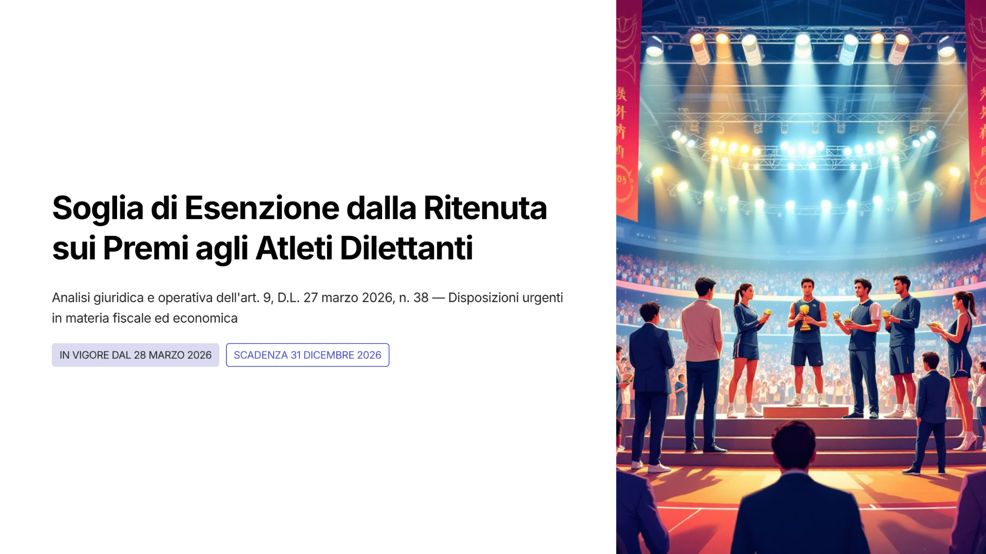 Acquista la Guida on line giuridica e operativa sui premi sportivi e la soglia dei 300,00€ riferiti all'art. 9, D.L. 27 marzo 2026, n. 38 — in vigore dal 28 Marzo 2026 al 31 Dicembre 2026